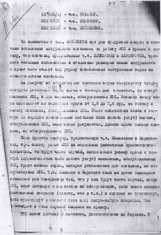 Записка на имя В.И.Сталина, В.М.Молотова, В.В.Куйбышева о системе исчисления натуроплаты МТС. 1 февраля 1933 г.