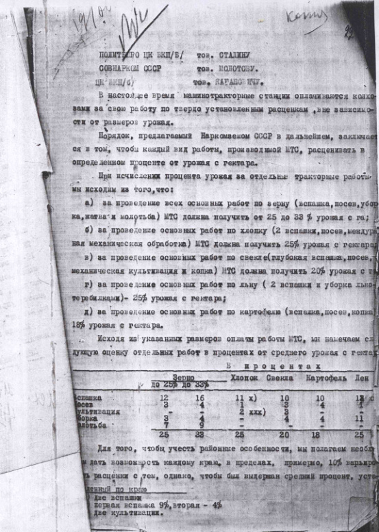 Записка на имя В.И.Сталина, В.М.Молотова, В.В.Куйбышева с предложениями НКЗ об исчисления натуроплаты МТС. 13 января 1933 г.
