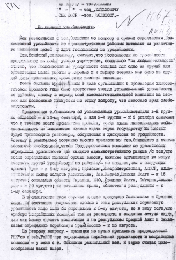 Записка М.А.Чернова на имя В.И.Сталина, В.М.Молотова, В.В.Куйбышева о разногласиях с Центр. Гос. Комиссией по опред. урожайности. 11 июля 1933 г.
