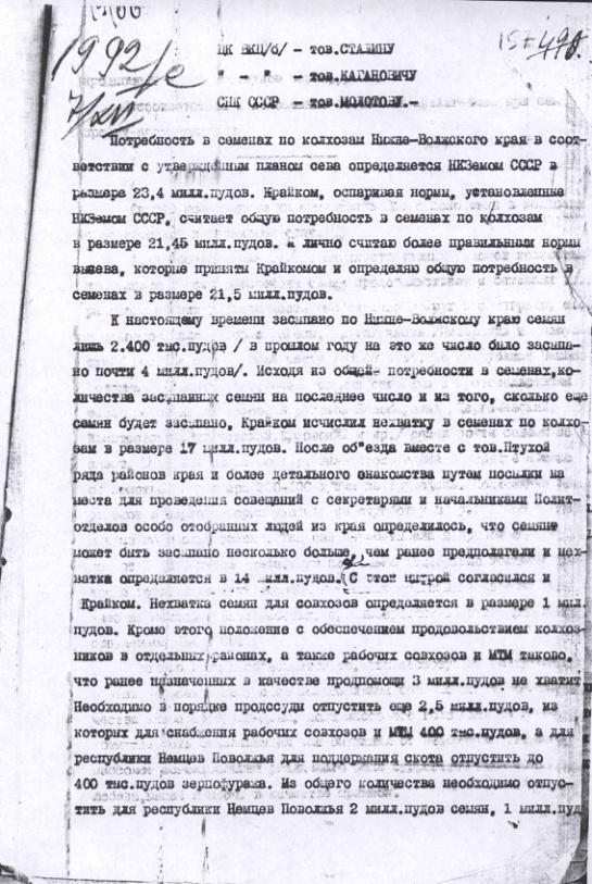 Записка М.А.Чернова на имя В.И.Сталина, В.М.Молотова, В.В.Куйбышева о положении в ряде колхозов Нижне-Волжского края. 7 декабря 1933 г.