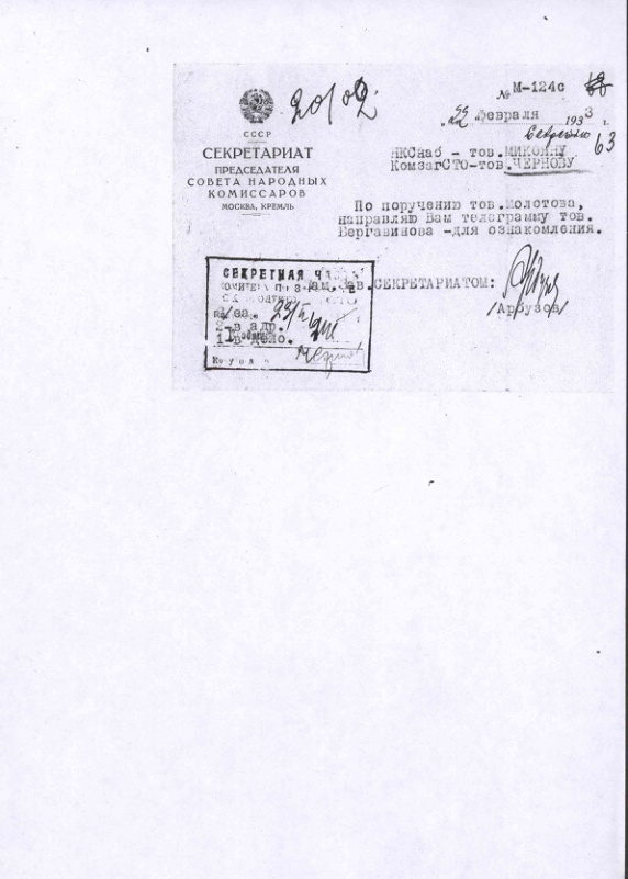 Письмо секретаря Далькрайкома Бергавинова о ситуации со снабжением Дальневосточного края. 22 февраля 1933 г.