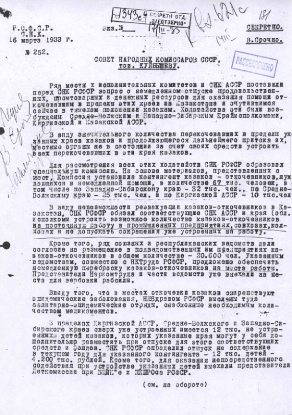 - Письмо председателя СНК РСФСР Сулимова с просьбой о выделении продовольственной помощи откочевавшим за пределы Казахстана казахам. 16 марта 1933 г.
