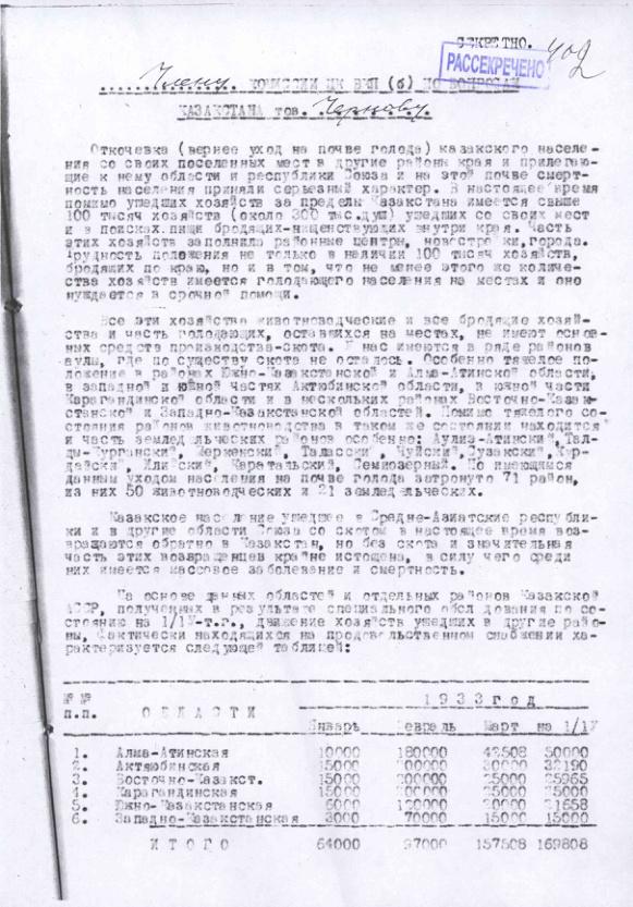 Письмо зам. председателя СНК Казахстана Кулумбетова о положении дел со снабжением голодающих. 22 мая 1933 г.