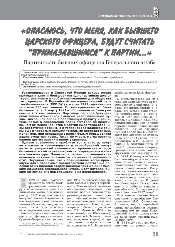 Опасаюсь, что меня, как бывшего царского офицера, будут считать "примазавшимся" к партии..." Партийность бывших офицеров Генерального штаба