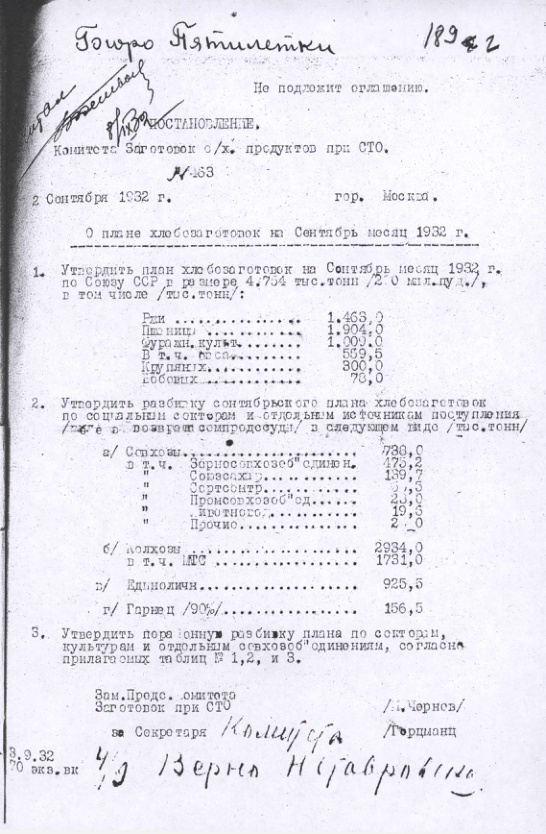 Постановление № 463 Комитета с.х. заготовок при СТО СССР. О плане хлебозаготовок на сентябрь 1932 г. 2 сентября 1932 г.