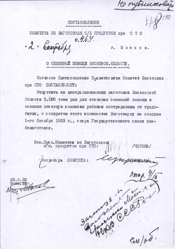 Постановление № 464 Комитета с.х. заготовок при СТО СССР. О семенной помощи Московской области. 2 сентября 1932 г.