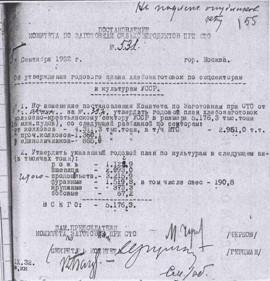 - Постановление № 531 Комитета с.х. заготовок при СТО СССР. Об утверждении годового плана хлебозаготовок по соцсекторам и культурам УССР. 25 сентября 1932 г.