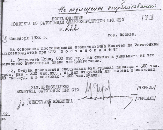 Постановление № 522 Комитета с.х. заготовок при СТО СССР. О выделении Крыму семенной ссуды и снижении плана хлебозаготовок. 23 сентября 1932 г.