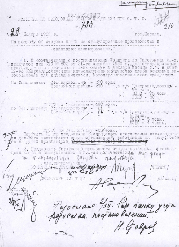 Постановление № 733 Комитета с.х. заготовок при СТО СССР. По вопросу об отпуске хлеба на стимулирование производства и заготовок зимних овощей. 29 ноября 1932 г.