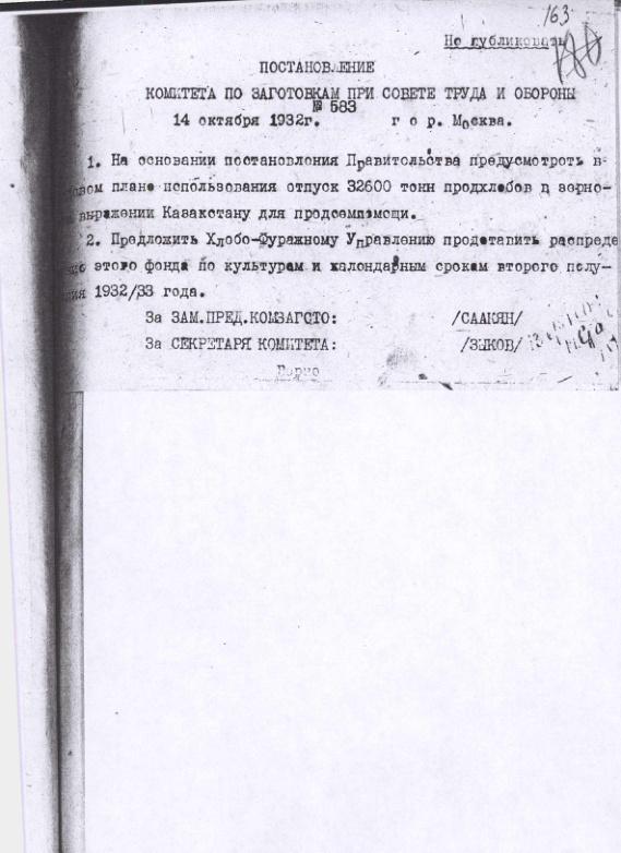 Постановление № 583 Комитета с.х. заготовок при СТО СССР. О плане продсемпомощи Казахстану. 14 октября 1932 г.
