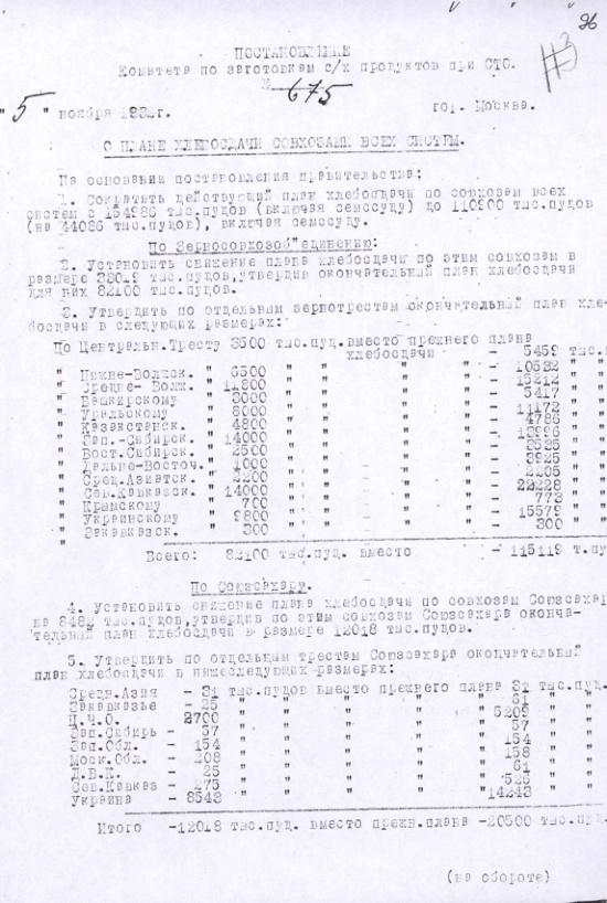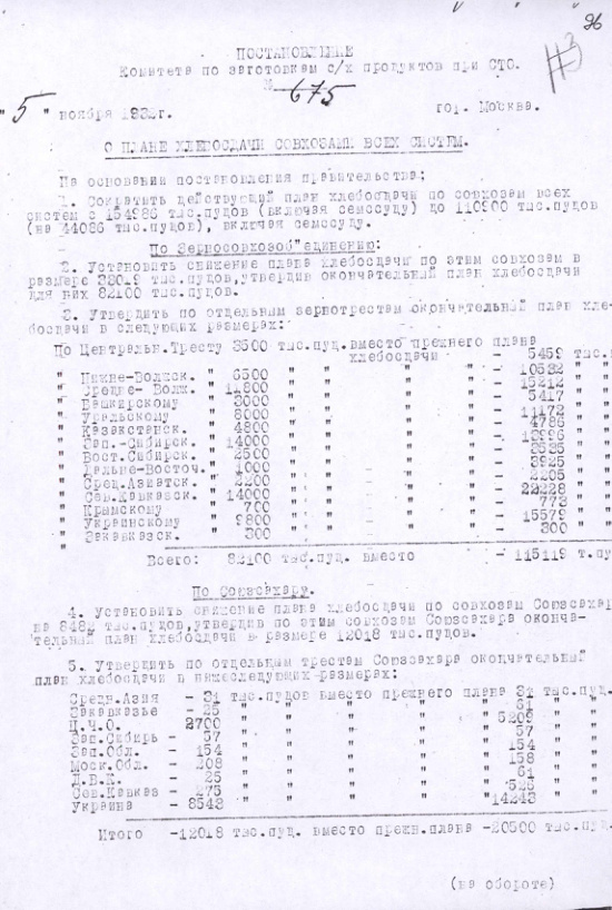 Постановление № 675 Комитета с.х. заготовок при СТО СССР. О плане хлебосдачи совхозами всех систем. 5 ноября 1932 г.