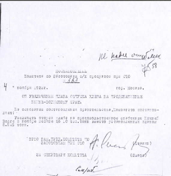 Постановление № 663 Комитета с.х. заготовок при СТО СССР. Об увеличении плана отпуска хлеба на продснабжение Нижне-Волжскому краю. 4 ноября 1932 г.