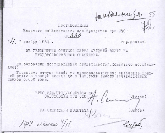 Постановление № 660 Комитета с.х. заготовок при СТО СССР. Об увеличении отпуска хлеба Средней Волге на продовольственное снабжение. 4 ноября 1932 г.