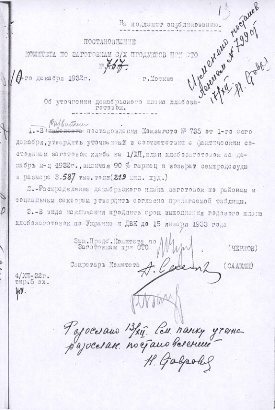 Постановление № 767 Комитета с.х. заготовок при СТО СССР. Об уточнении декабрьского плана хлебозаготовок. 10 декабря 1932 г.