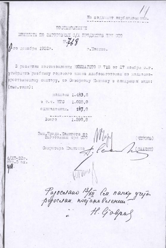 Постановление № 768 Комитета с.х. заготовок при СТО СССР. О разбивке плана хлебозаготовок по колхозно-крестьянскому сектору по Сев. Кавказе. 10 декабря 1932 г.