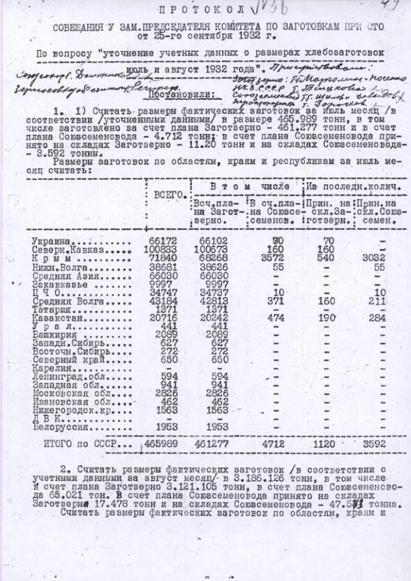 Протокол совещания у зам. комитета по заготовкам при СТО СССР от 25 сентября 1932 г.