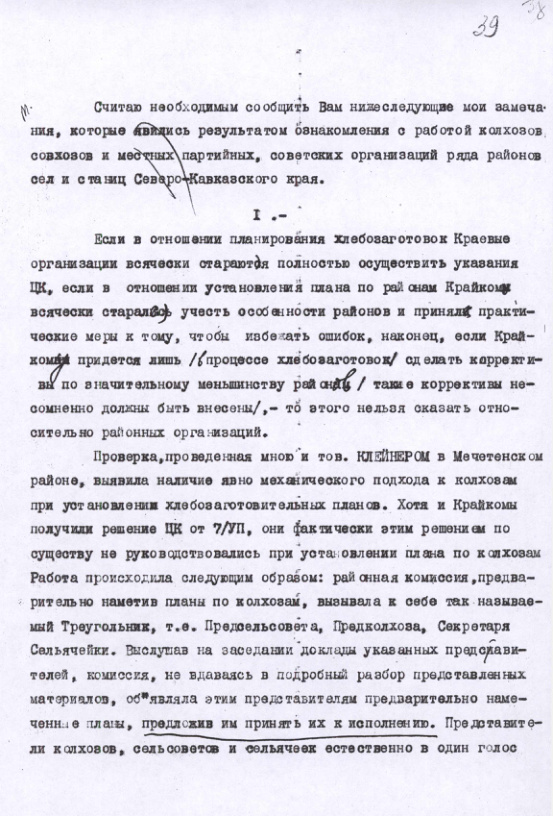 - Черновик докладной записки Комитета Заготовок при СТО СССР о работе колхозов, совхозов, партийных и советских организаций Северного Кавказа. Август 1932 г.