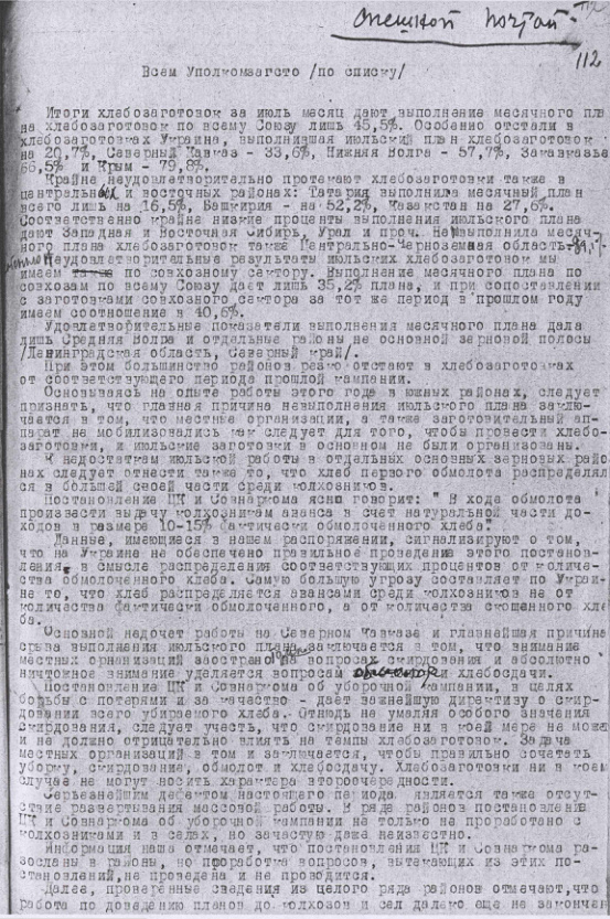Письмо Комитета Заготовок при СТО СССР о ходе уборочной кампании в июле 1932 г. 7 августа 1932 г.
