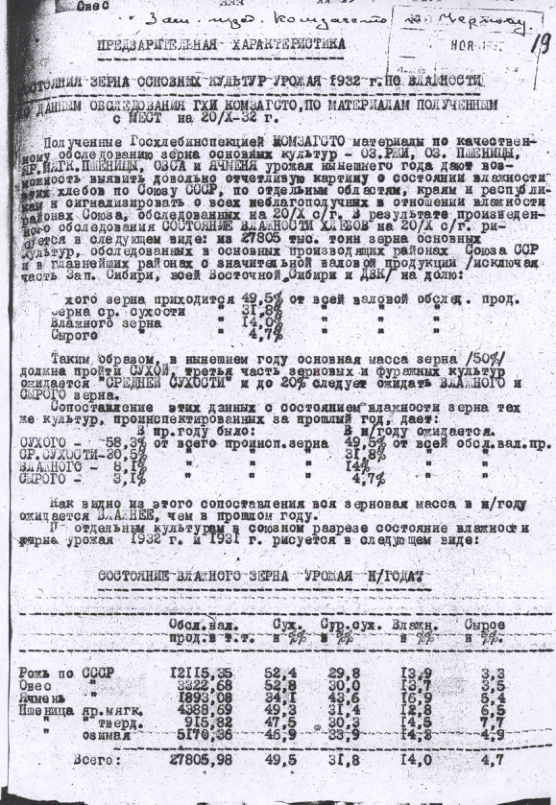 Справка Комитета Заготовок при СТО СССР с предварительной характеристикой зерна на 20 октября 1932 г.