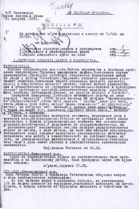 Выписка № 22 из писем уполномоченных и контор Заготзерно с 25 по 30 августа 1932 г.