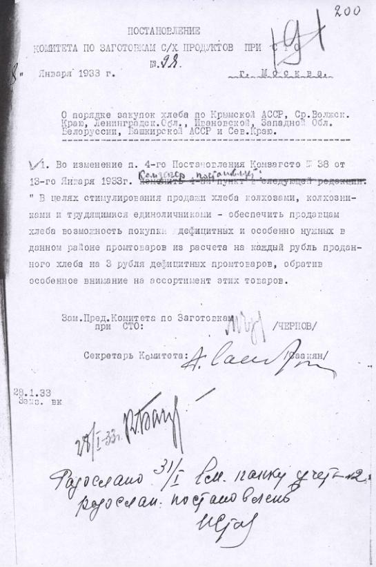 Постановление № 98 Комитета с.х. заготовок при СТО СССР. О порядке закупки хлеба. 28 января 1933 г.