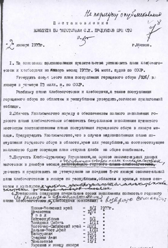 Постановление № 5 Комитета с.х. заготовок при СТО СССР. О плане хлебозаготовок на январь 1933 г. 2 января 1933 г.