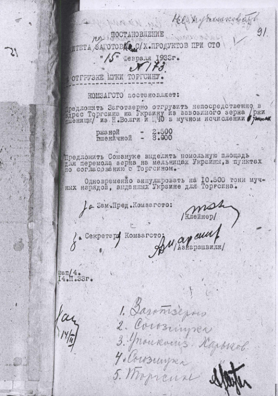 Постановление № 173 Комитета с.х. заготовок при СТО СССР. От отгрузке зерна в адрес Торгсина на Украину. 15 февраля 1933 г.