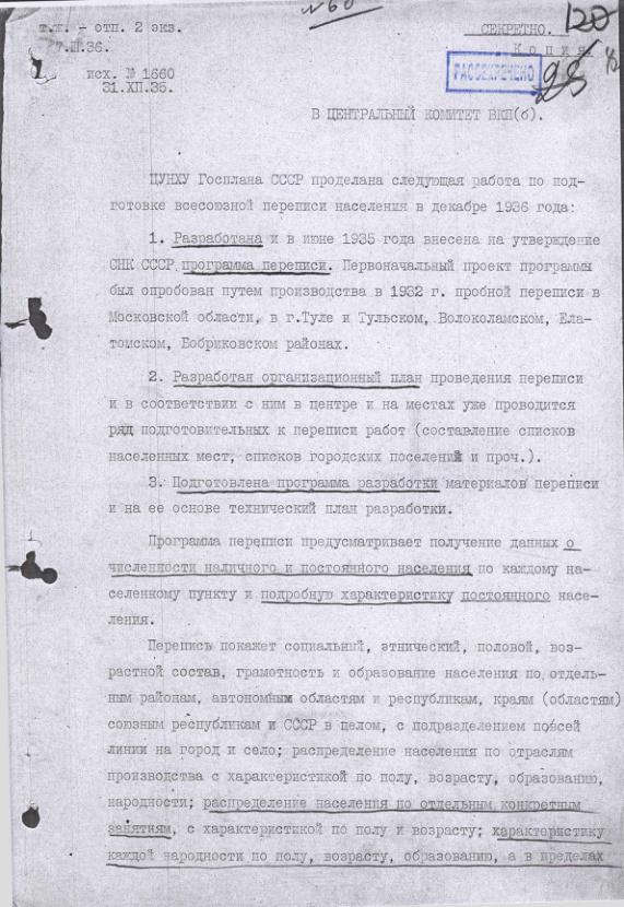 Отчет начальника ЦУНХУ И.А.Краваля о подготовке переписи населения в 1936 г. 31 декабря 1935 г.