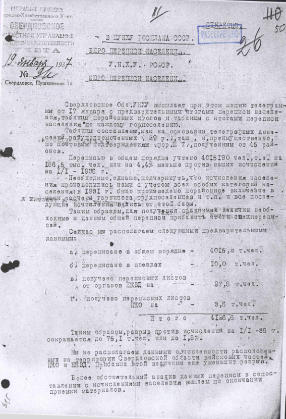 Письмо Свердловского УНХУ с предварительными итогами переписи населения по Свердловской области. 19 января 1937 г.