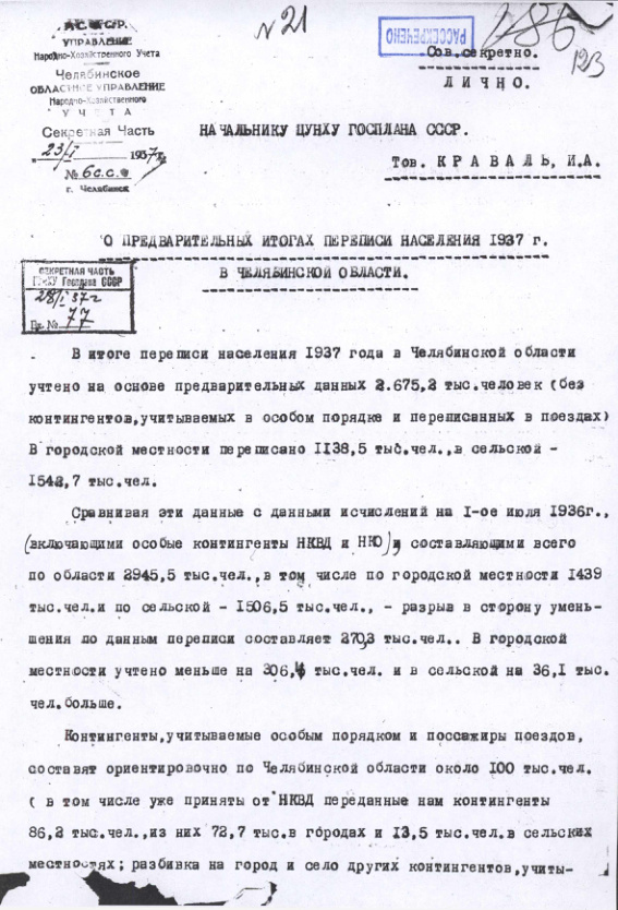 Письмо Челябинского УНХУ с предварительными итогами переписи населения по Челябинской области. 23 января 1937 г.