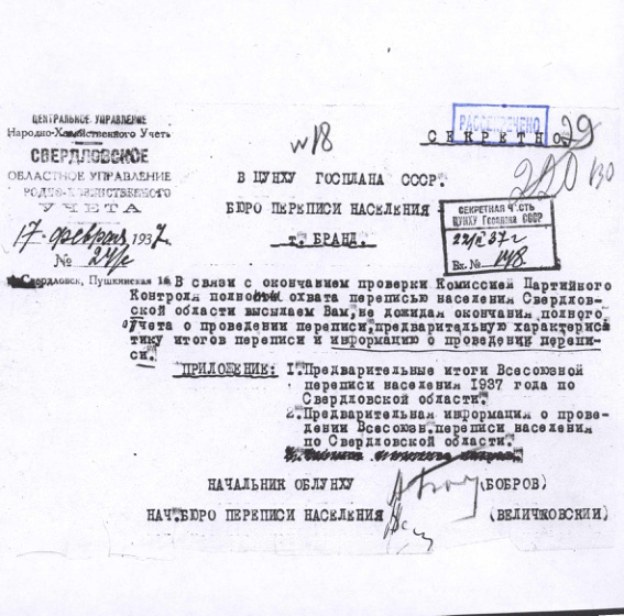 Письмо Свердловского УНХУ с предварительными итогами переписи населения по Свердловской области. 17 февраля 1937 г.