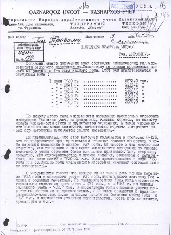 Справка УНХУ Казахской АССР о численности населения республики в период с 1926 г. по 1936 гг. 14 января 1937 г.