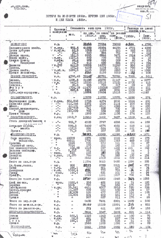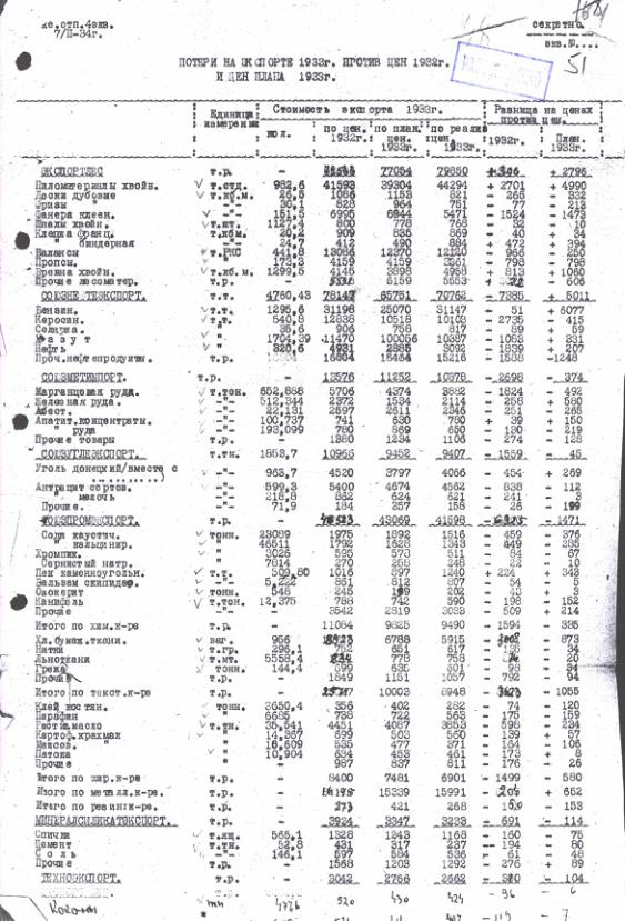 Справка о потерях на экспорте 1933 г. против цен 1932 г. и цен плана 1933 г. 7 февраля 1934 г.