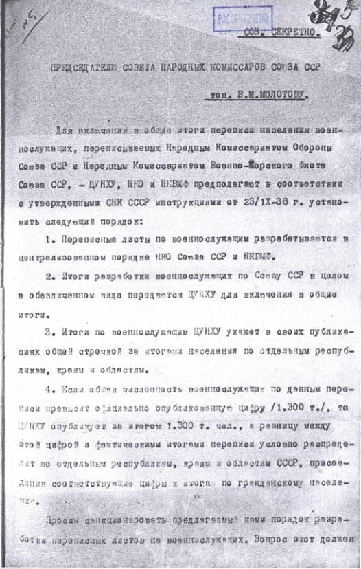 Письмо ЦУНХУ о порядке публикования численности вооруженных сил СССР в итогах переписи населения 1939 г. 25 января 1939 г.