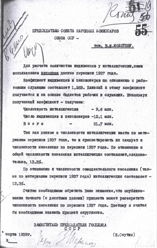 Справка о численности интеллигенции и иждивенцев в СССР по данным переписи населения 1937 г. Март 1939 г.