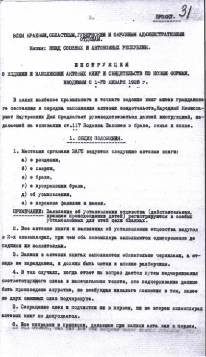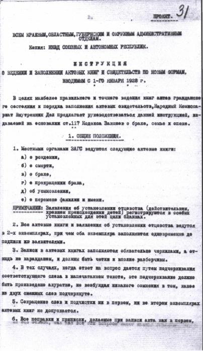 Инструкция о ведении и заполнении актовых книг органами ЗАГС. 1 января 1928 г.