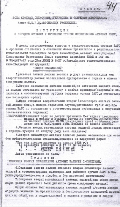 Проект инструкции о порядке отсылки и проверки вторых экземпляров актовых книг. 1928