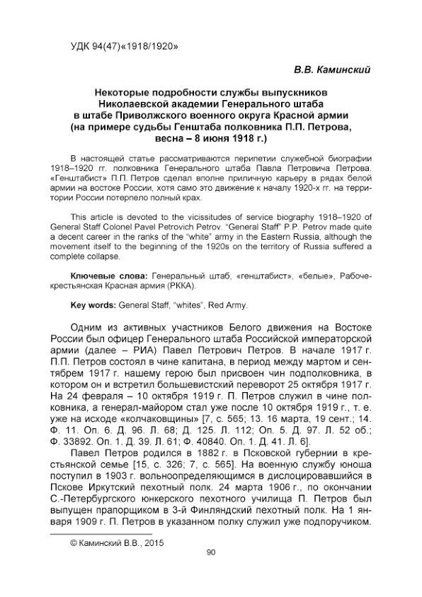 Некоторые подробности службы выпускников Николаевской академии Генерального штаба в штабе Приволжского военного округа Красной армии (на примере судьбы Генштаба полковника П.П. Петрова, весна – 8 июня 1918 г.)