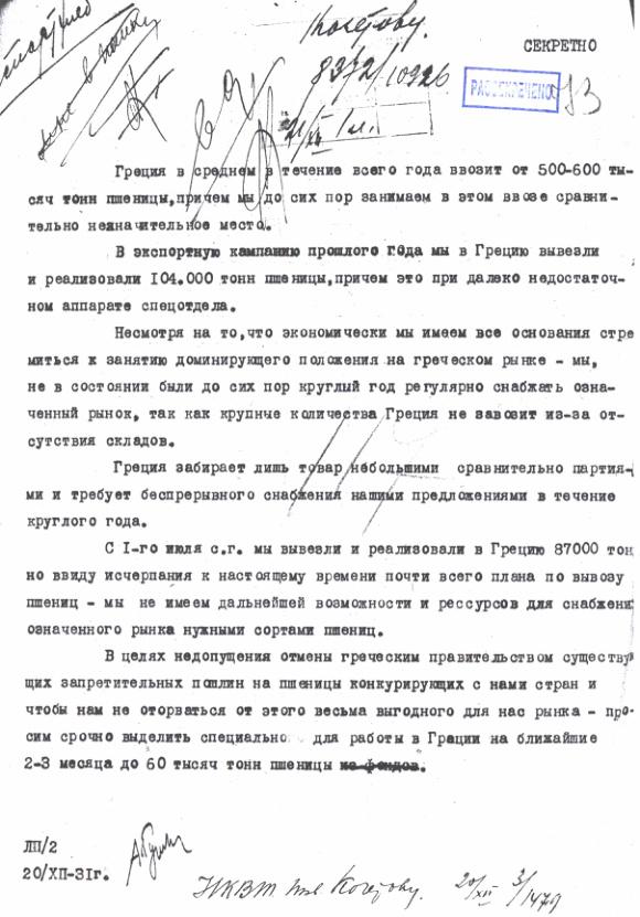 Докладная записка НКВТ об экспорте зерна в Грецию. 20 июля 1931 г.