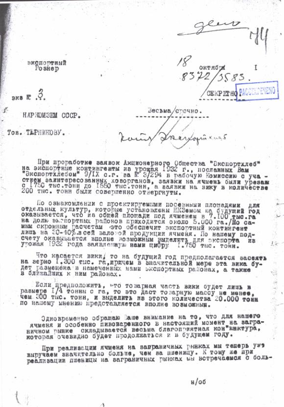 Записка НКВТ в Наркомат Земледелия о расширения посевов ячменя на экспорт. 18 октября 1931 г.