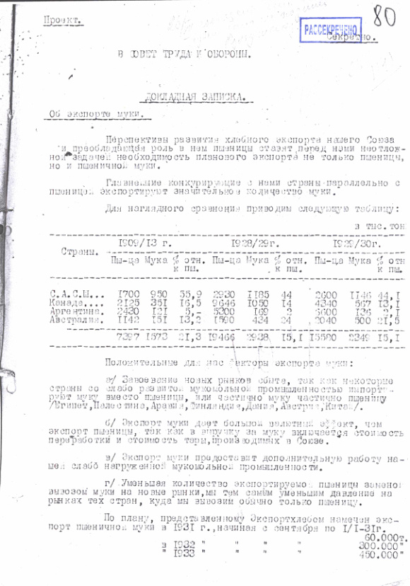Докладная записка НКВТ в СТО о перспективах экспорта муки и проектом постановления. 17 июня 1931 г.