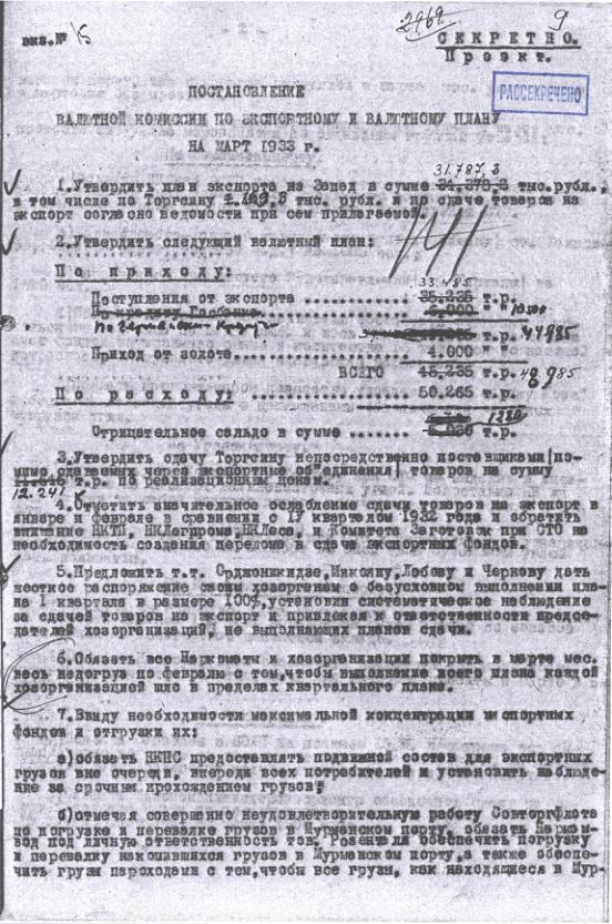 Проект постановления Валютной комиссии по экспортному и валютному плану на март 1933 г. 22 февраля 1933 г.