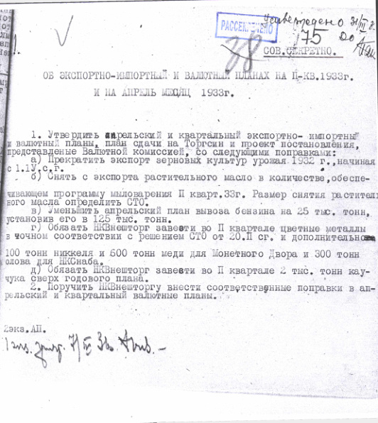 Постановление Валютной комиссии при СНК СССР по экспортно-импортному и валютному плану на II квартал 1933 г. 2 апреля 1933 г.