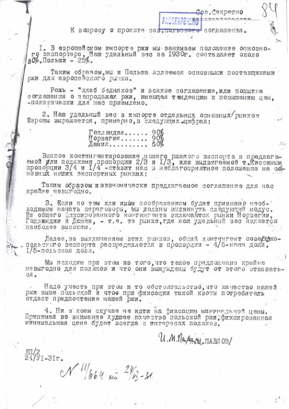 Записка НКВТ с оценкой проекта советского-польского соглашения об экспорте ржи. 24 июня 1931 г.