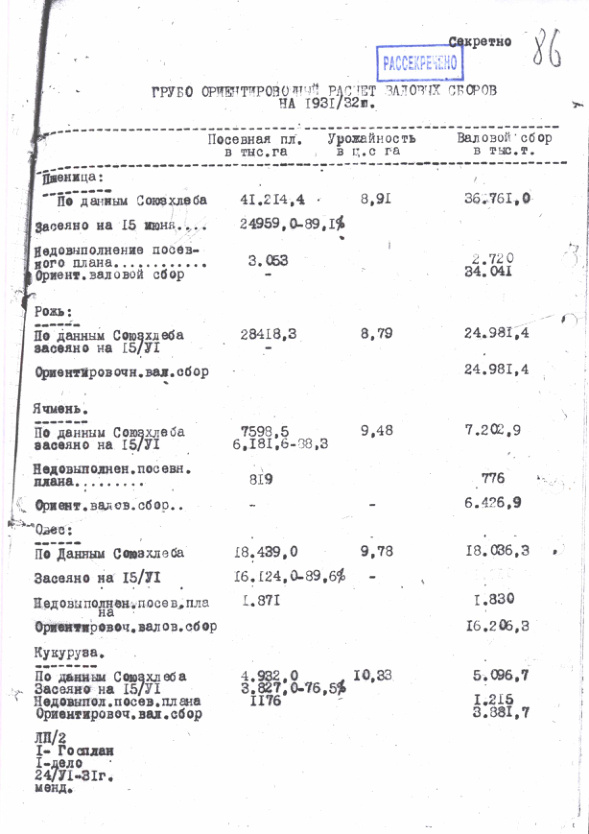 - Записка НКВТ с ориентировочным расчетом валовых сборов зерновых урожая 1931 г. и предварительной оценкой размеров экспорта. 24 июня 1931 г.