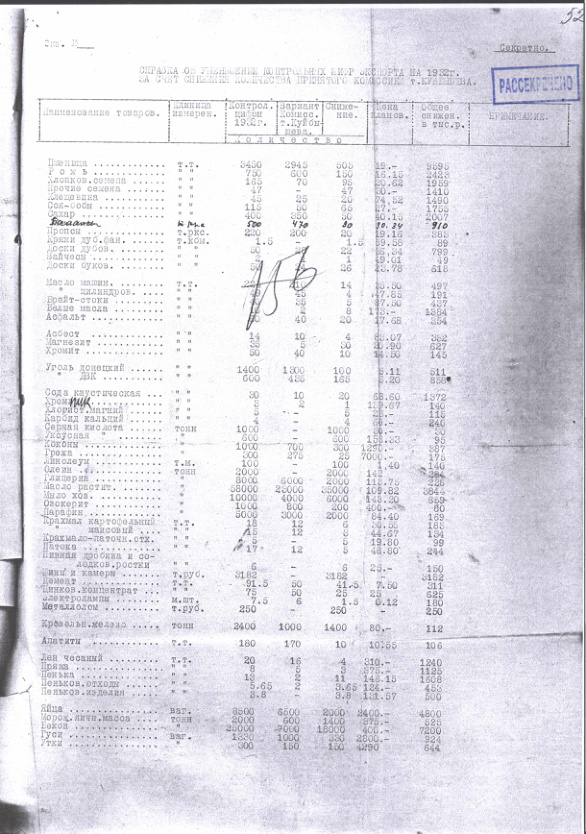 Справка об уменьшении контрольных цифр экспорта на 1932 г. принятых комиссией т. Куйбышева. 29 декабря 1931 г.