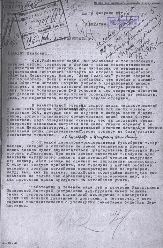 Письмо руководства Экспортхлеба о кадровых назначениях и кредитовании советского хлебного экспорта в Англии. 19 февраля 1931 г.