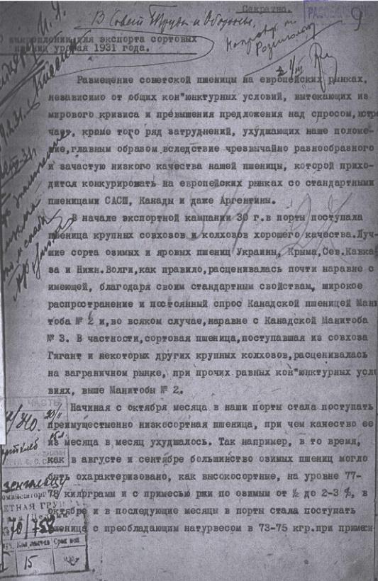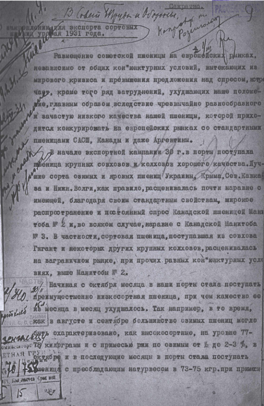 Письмо НКВТ об экспорте сортовой пшеницы и состоянии европейского хлебного рынка. 19 февраля 1931 г.