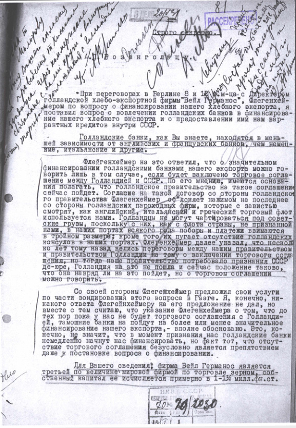 Письмо представителя Экспортхлеба об участии банков Голландии в финансировании советского хлебного экспорта. 20 мая 1931 г.