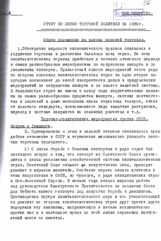 Аналитическая записка НКВТ "Отчет по линии торговой политики за 1931 г." 17 января 1932 г.